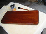 | 2 The boards are glued with waterproof adhesive, and clamped together. | | 6 The lettering and motif are hand-carved, THROUGH the paper mask, using traditional double-bevel chisels. The carved areas are then sealed. |
