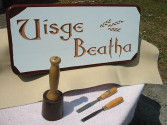 The lettering and motif are hand-carved, THROUGH the paper mask, using traditional double-bevel chisels. The carved areas are then sealed.
